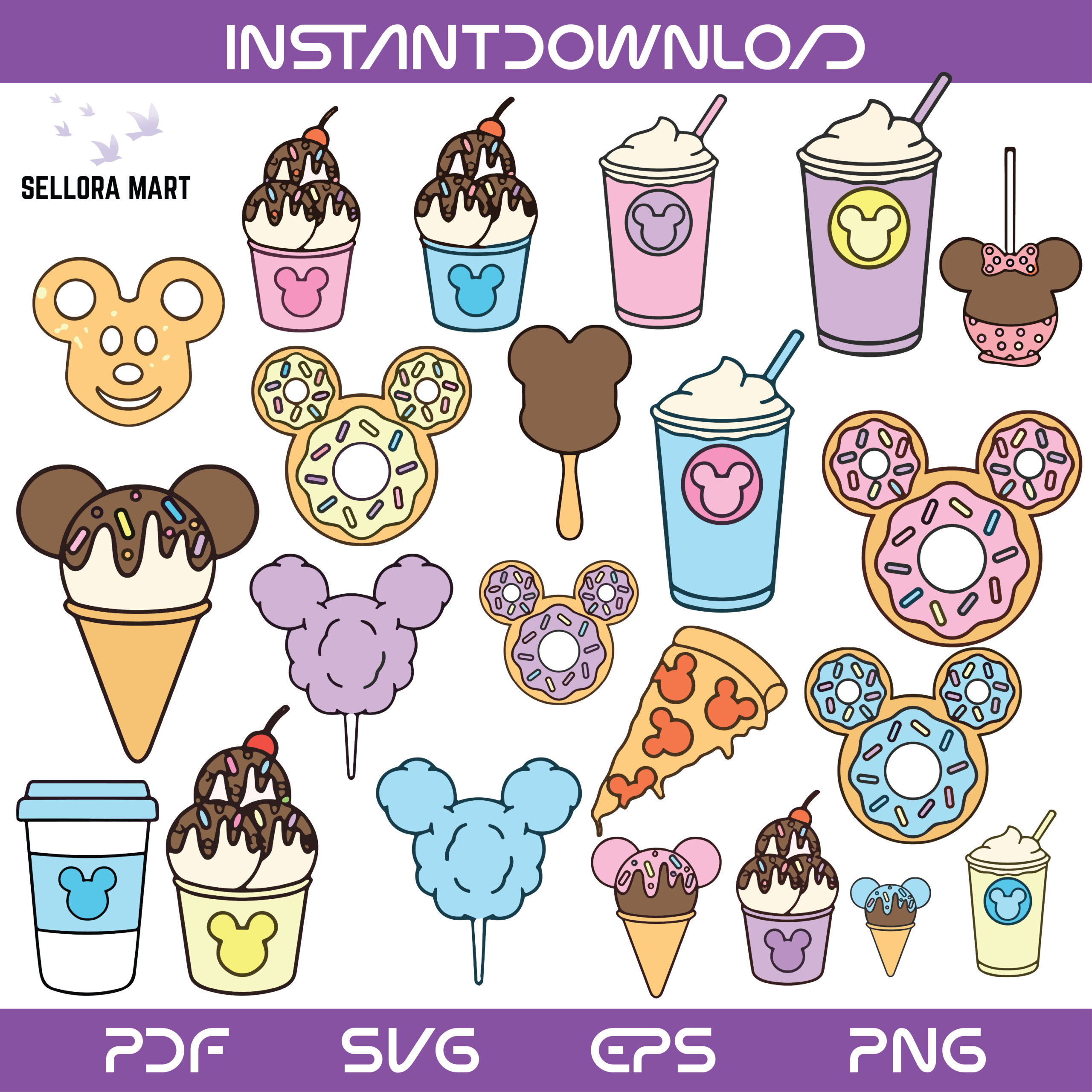 This adorable collection features cute Disney-style treats including ice creams, donuts, milkshakes, popsicles, cotton candy, pizza, and snack cups, perfect for fun crafts and Disney-inspired designs.