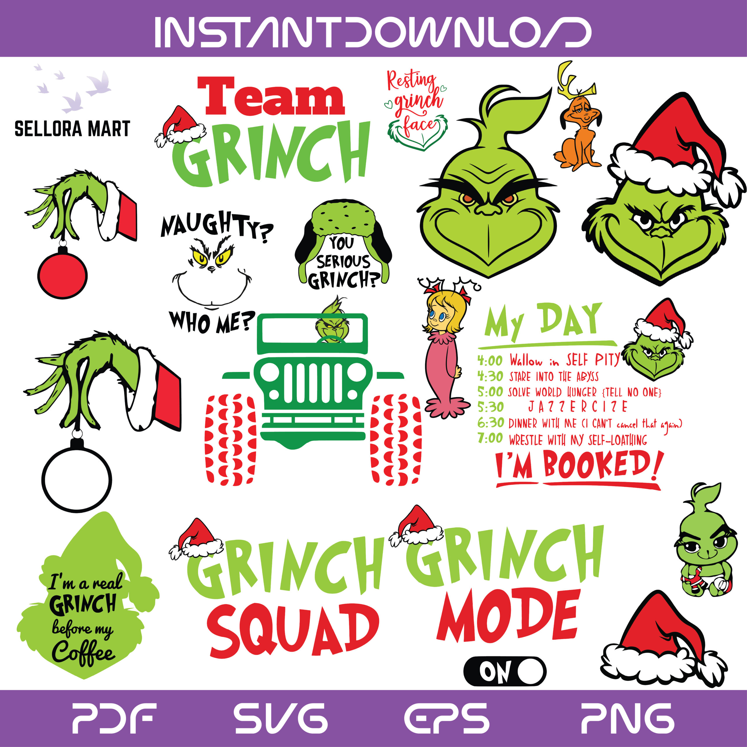 This playful collection features Team Grinch designs, Grinch faces, funny quotes, Grinch mode graphics, and Christmas-themed elements, perfect for holiday crafts and winter projects.