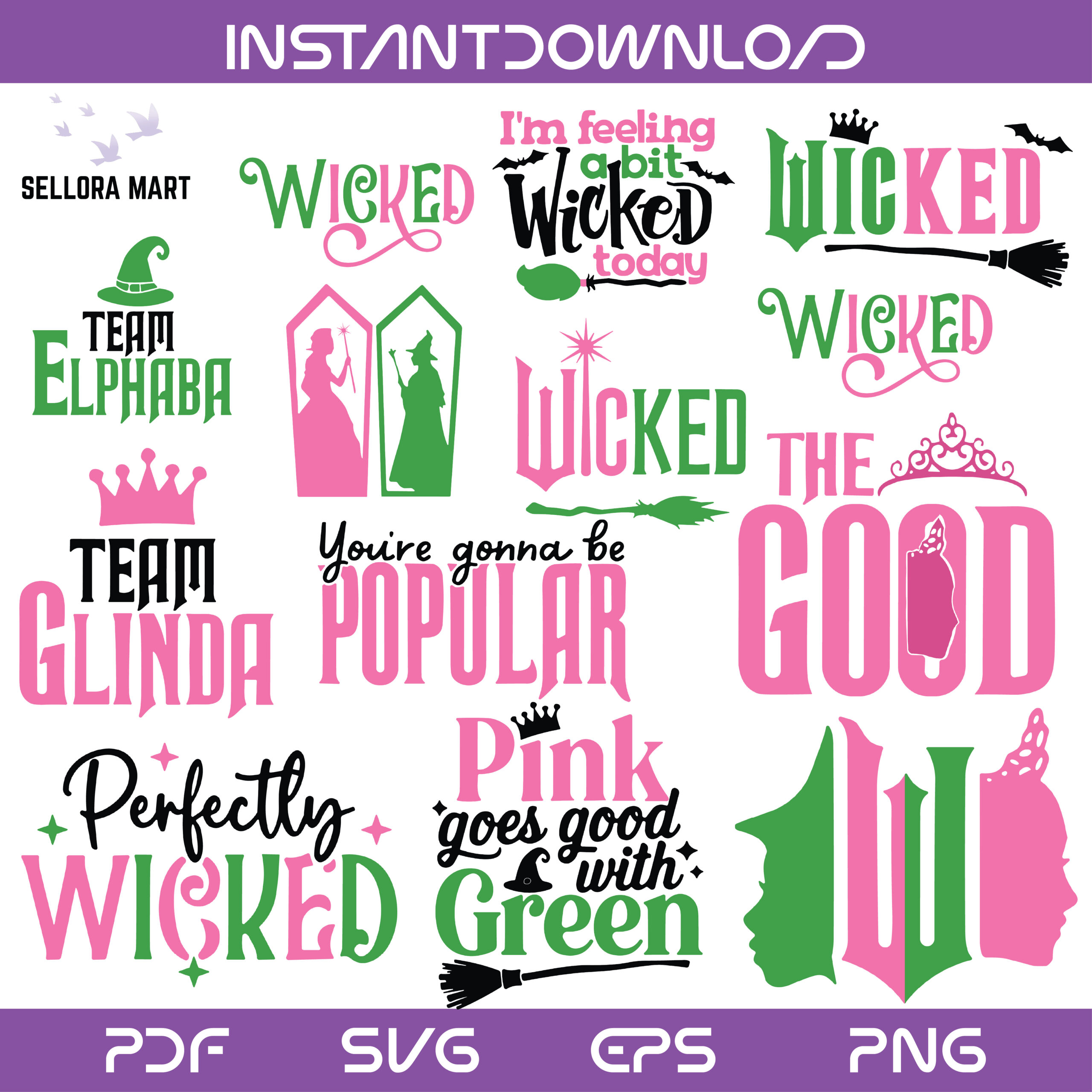 This stylish collection features Team Elphaba & Team Glinda designs, iconic Wicked quotes, pink and green typography, witch silhouettes, and musical-inspired graphics, perfect for fans of Wicked and theater lovers.